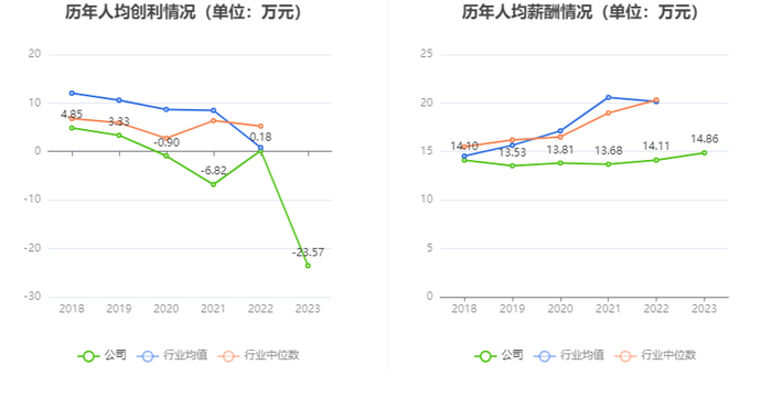 截至2023年末,公司员工总数为5875人,人均创收31.53万元,人均创利-23.57万元,人均薪酬14.86万元,较上年同期分别变化-47.00%、-13066.09%、5.37%。