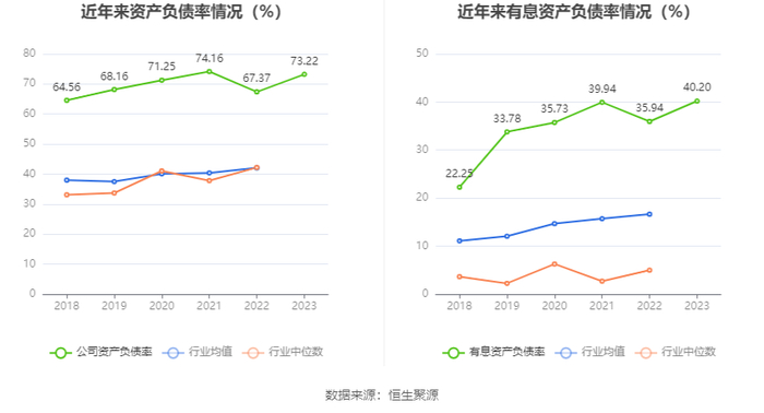 在偿债能力方面,公司2023年年末资产负债率为73.22%,相比上年末上升5.85个百分点;有息资产负债率为40.20%,相比上年末上升4.26个百分点。