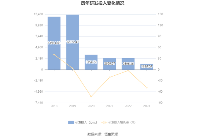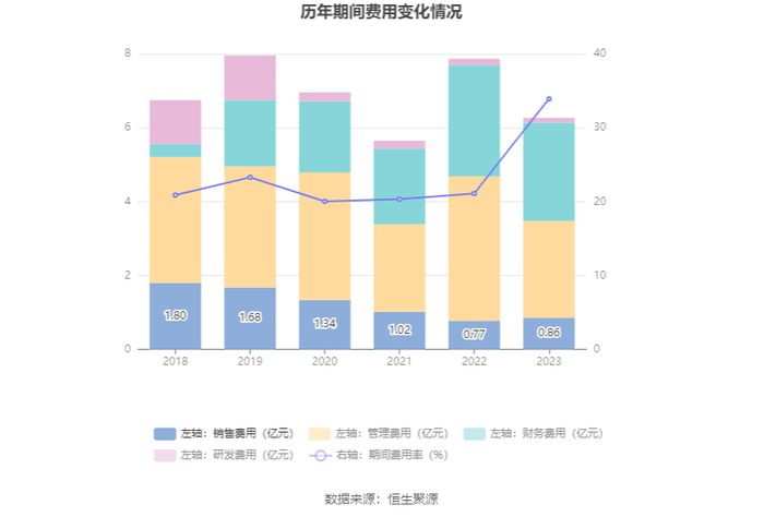 2023年,公司期间费用为6.28亿元,较上年同期减少1.58亿元;但期间费用率为33.92%,较上年同期上升12.81个百分点。其中,销售费用同比增长11.69%,管理费用同比下降33.06%,研发费用同比下降19.82%,财务费用同比下降11.38%。