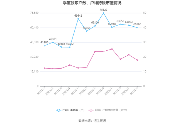 筹码集中度方面,截至2023年年末,公司股东总户数为6.06万户,较三季度末下降了2437户,降幅3.87%;户均持股市值由三季度末的21.52万元下降至17.90万元,降幅为16.82%。