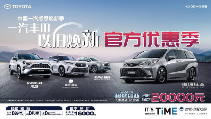 不止如此,一汽丰田还公布了“以旧焕新官方优惠季”的开启信息,全面响应国家政策,在原有优惠基础上加码增新,4月25日-5月10日,2024款格瑞维亚尊享20000元限时权益,一汽丰田全车系可享至高8年0首付起、36期0利率、505 弹性金融方案等多重金融政策,及至高16000元的置换补贴,助力用户轻松开启高品质出行生活。展示出一汽丰田作为央企合资企业,赋能中国汽车行业实现高质量发展的责任与担当。