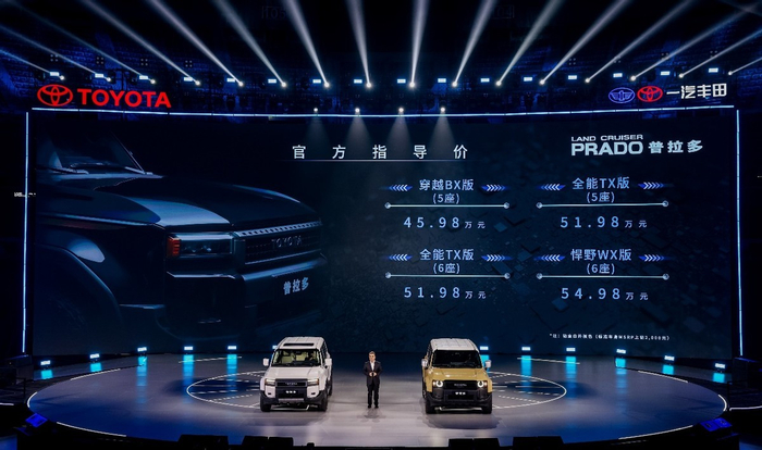 此次发布会上,备受关注的全新普拉多也正式发布官方指导价,新车包含:穿越BX版(5座):45.98万元:全能TX版(5座):51.98万元、全能TX版(6座):51.98万元、悍野WX版(6座):54.98万元,四大版本覆盖了硬派越野从个性化、时尚化再到高端化等不同细分市场。同时,一汽丰田还推出官方联名改装商品线“上新了!PRADO”,首批官方改装套件的探索套装、精英套装和蒙娜丽莎套装也正式开启预售,供用户从心而选。