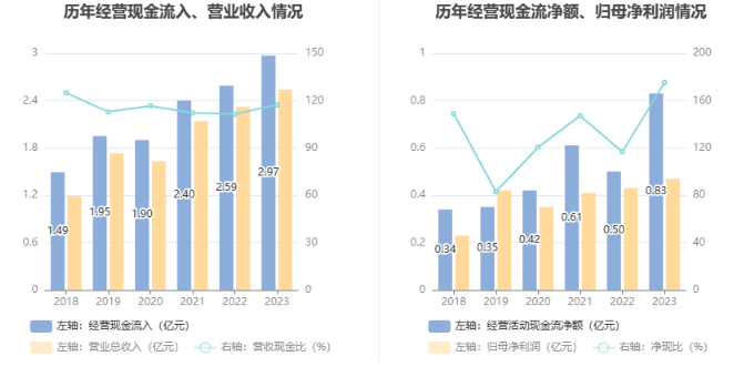 2023年,公司营业收入现金比为117.26%,净现比为175.32%。