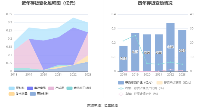 从存货变动来看,截至2023年年末,公司存货账面价值为2920.37万元,占净资产的5.11%,较上年末减少433.24万元。其中,存货跌价准备为17.48万元,计提比例为0.59%。