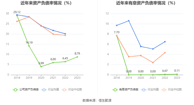 在偿债能力方面,公司2023年年末资产负债率为8.79%,相比上年末上升2.34个百分点;有息资产负债率为0.11%,相比上年末上升0.04个百分点。