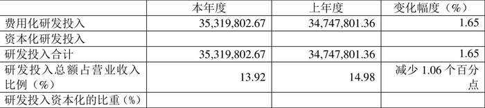 2023年全年,公司研发投入金额为3531.98万元,同比增长1.65%;研发投入占营业收入比例为13.92%,相比上年同期下降1.06个百分点。