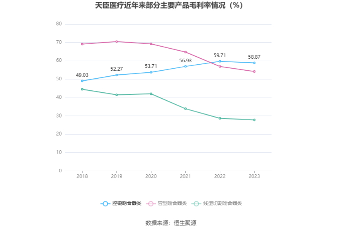 分产品看,腔镜吻合器类、管型吻合器类、线型切割吻合器类2023年毛利率分别为58.87%、54.16%、27.81%。