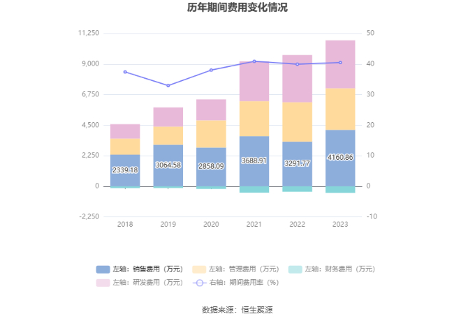 2023年,公司期间费用为1.03亿元,较上年同期增加1003.63万元;期间费用率为40.50%,较上年同期上升0.55个百分点。其中,销售费用同比增长26.4%,管理费用同比增长5.4%,研发费用同比增长1.65%,财务费用由去年同期的-395.22万元变为-474.25万元。