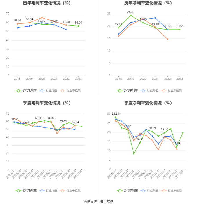 2023年,公司毛利率为56.09%,同比下降1.19个百分点;净利率为18.65%,较上年同期上升0.03个百分点。从单季度指标来看,2023年第四季度公司毛利率为54.13%,同比上升5.12个百分点,环比下降0.91个百分点;净利率为19.74%,较上年同期上升1.86个百分点,较上一季度上升7.71个百分点。