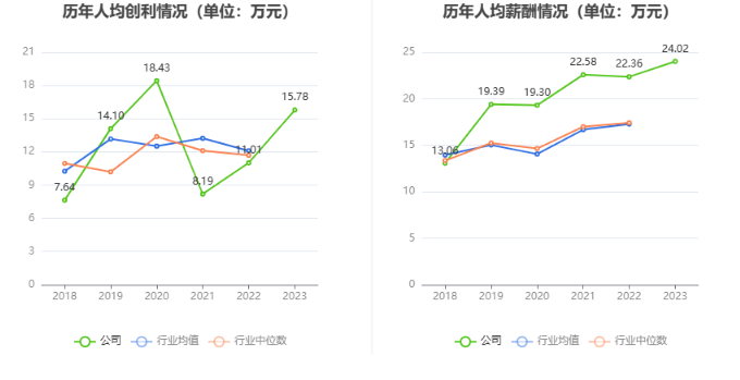 截至2023年末,公司员工总数为586人,人均创收117.44万元,人均创利15.78万元,人均薪酬24.02万元,较上年同期分别增长1.44%、43.29%、7.44%。