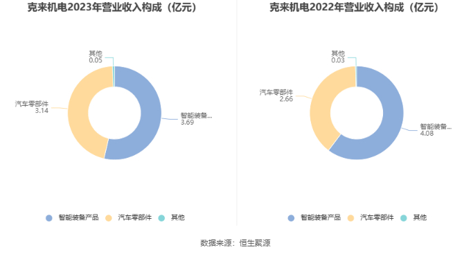 分产品来看,2023年公司主营业务中,智能装备产品收入3.69亿元,同比下降9.47%,占营业收入的53.68%;汽车零部件收入3.14亿元,同比增长18.04%,占营业收入的45.67%。