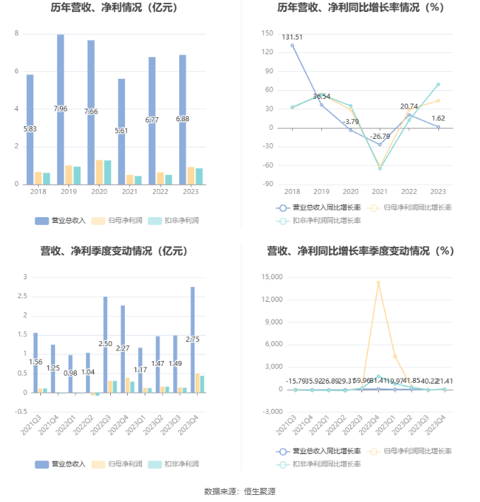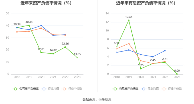 在偿债能力方面,公司2023年年末资产负债率为13.65%,相比上年末下降8.71个百分点;有息资产负债率为0,相比上年末下降2.71个百分点。