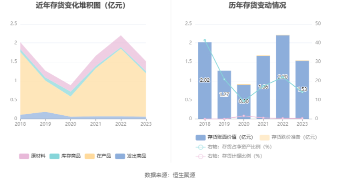 从存货变动来看,截至2023年年末,公司存货账面价值为1.53亿元,占净资产的14.09%,较上年末减少6714.73万元。其中,存货跌价准备为50.3万元,计提比例为0.33%。
