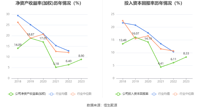 数据显示,2023年公司加权平均净资产收益率为8.90%,较上年同期增长2.50个百分点;公司2023年投入资本回报率为8.33%,较上年同期增长2.22个百分点。