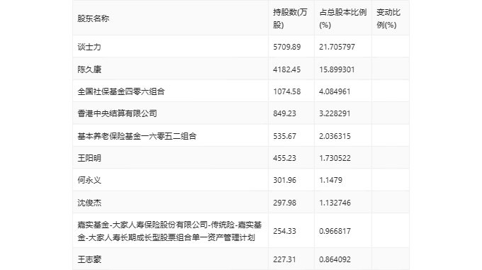 年报显示,2023年年末公司十大流通股东中,新进股东为嘉实基金-大家人寿保险股份有限公司-传统险-嘉实基金-大家人寿长期成长型股票组合单一资产管理计划、王志豪,取代了三季度末的交通银行股份有限公司-汇丰晋信智造先锋股票型证券投资基金1、交通银行股份有限公司-汇丰晋信智造先锋股票型证券投资基金2。在具体持股比例上,谈士力、陈久康、全国社保基金四零六组合、香港中央结算有限公司、基本养老保险基金一六零五二组合、王阳明、何永义、沈俊杰持股有所上升。
