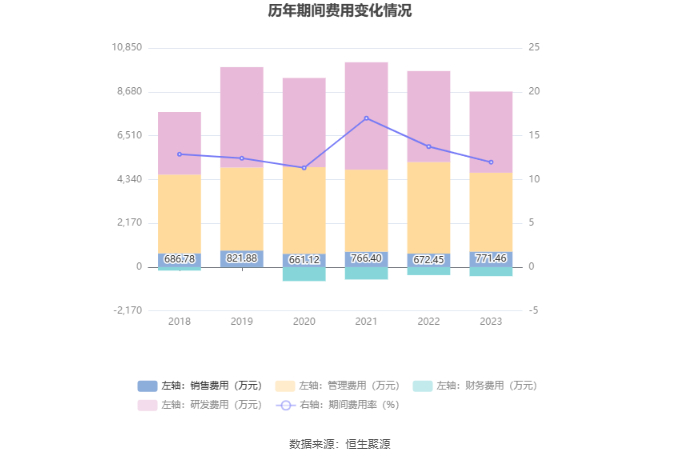 2023年,公司期间费用为8247.44万元,较上年同期减少1065.32万元;期间费用率为11.98%,较上年同期下降1.77个百分点。其中,销售费用同比增长14.72%,管理费用同比下降13.8%,研发费用同比下降10.82%,财务费用由去年同期的-395.10万元变为-447.06万元。
