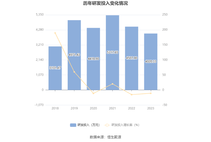 2023年全年,公司研发投入金额为4020.33万元,同比下降10.82%;研发投入占营业收入比例为5.84%,相比上年同期下降0.82个百分点。此外,公司全年研发投入资本化率为0。