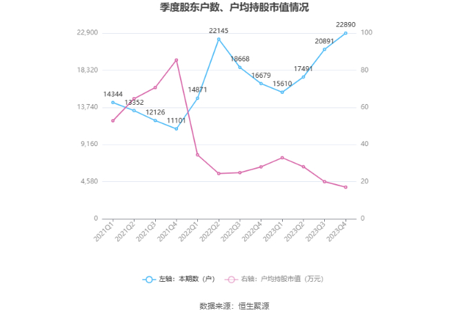 筹码集中度方面,截至2023年年末,公司股东总户数为2.29万户,较三季度末增长了1999户,增幅9.57%;户均持股市值由三季度末的20.07万元下降至17.09万元,降幅为14.85%。