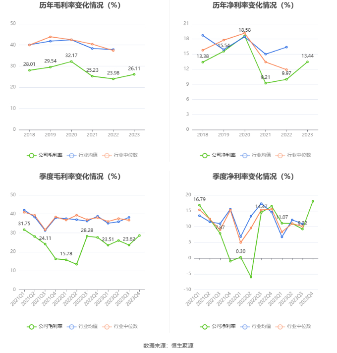 2023年,公司毛利率为26.11%,同比上升2.13个百分点;净利率为13.44%,较上年同期上升3.47个百分点。从单季度指标来看,2023年第四季度公司毛利率为28.65%,同比上升1.03个百分点,环比上升5.03个百分点;净利率为18.04%,较上年同期上升1.57个百分点,较上一季度上升8.82个百分点。