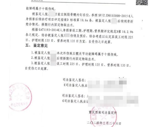 张同学介绍,第一次开庭主要是确定鉴定机构。张同学提供的司法鉴定书显示,2024年3月26日,重庆西南司法鉴定所鉴定认为,她本次外伤致左髋关节功能十级伤残。其左侧股骨髓内钉在位,后续视骨折愈合情况,择期行内固定物取出术。