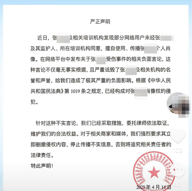 红星新闻注意到,远伦舞蹈帐号2023年2023年4月曾发布一则声明。落款为重庆高新技术产业开发区新远伦教育培训学校有限公司(下称远伦培训学校)。声明称,近日,张某涵及相关培训机构发现部分网络用户未经张某涵及其监护人、所在培训机构同意,擅自使用、传播张某涵个人肖像。在网络平台中发布关于受伤事件的相关负面言论,这种言论不仅毫无事实根据,且严重诋毀了张某涵及相关机构的名誉和声誉,给公司造成了极其严重的负面影响,已经构成对张某涵肖像权的侵犯。