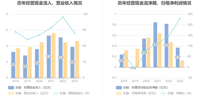 2023年,公司营业收入现金比为84.03%,净现比为275.82%。