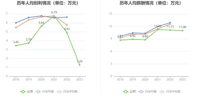 截至2023年末,公司员工总数为1043人,人均创收44.50万元,人均创利1.29万元,人均薪酬11.00万元,较上年同期分别下降5.53%、73.79%、1.11%。