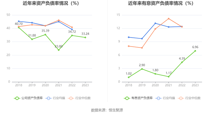 在偿债能力方面,公司2023年年末资产负债率为33.24%,相比上年末下降1.48个百分点;有息资产负债率为6.96%,相比上年末上升2.57个百分点。