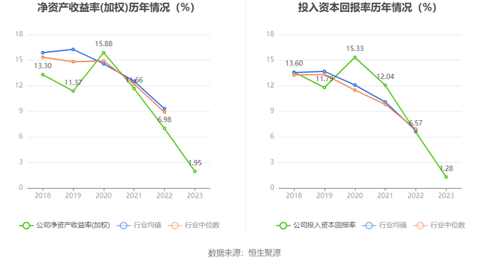 数据显示,2023年公司加权平均净资产收益率为1.95%,较上年同期下降5.03个百分点;公司2023年投入资本回报率为1.28%,较上年同期下降5.29个百分点。