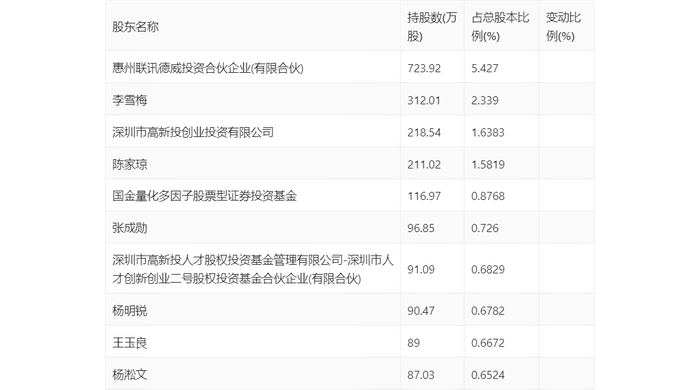 年报显示,2023年年末公司十大流通股东中,新进股东为陈家琼、国金量化多因子股票型证券投资基金,取代了三季度末的UBS AG、南方大数据100指数证券投资基金。在具体持股比例上,杨淞文持股有所上升,惠州联讯德威投资合伙企业(有限合伙)、深圳市高新投创业投资有限公司、深圳市高新投人才股权投资基金管理有限公司-深圳市人才创新创业二号股权投资基金合伙企业(有限合伙)、杨明锐持股有所下降。