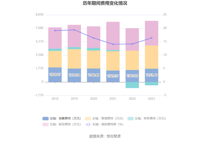 2023年,公司期间费用为7614.02万元,较上年同期增加1327.38万元;期间费用率为16.41%,较上年同期上升2.27个百分点。其中,销售费用同比增长10.36%,管理费用同比增长20.27%,研发费用同比增长9.74%,财务费用由去年同期的-796.12万元变为-435.24万元。