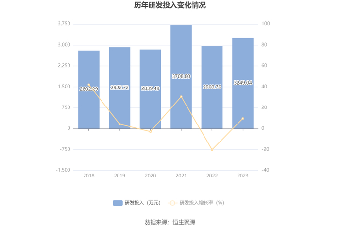 2023年全年,公司研发投入金额为3249.04万元,同比增长9.74%;研发投入占营业收入比例为7.00%,相比上年同期上升0.34个百分点。