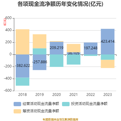 2023年,公司经营活动现金流净额为423.41亿元,同比增长114.66%;筹资活动现金流净额-135.39亿元,同比减少134.75亿元;投资活动现金流净额-88.82亿元,上年同期为-24.49亿元。