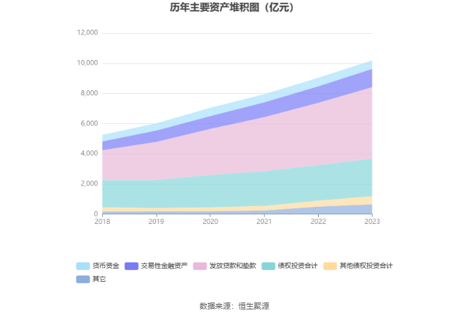 资产重大变化方面,截至2023年年末,公司债权投资合计较上年末增加5.27%,占公司总资产比重下降1.73个百分点;买入返售金融资产较上年末增加87.02%,占公司总资产比重上升1.43个百分点;其他债权投资合计较上年末增加38.03%,占公司总资产比重上升0.97个百分点;发放贷款和垫款较上年末增加14.81%,占公司总资产比重上升0.83个百分点。