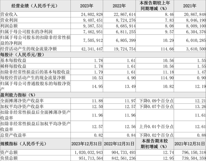 数据显示,2023年公司加权平均净资产收益率为12.5%,较上年同期下降0.07个百分点。
