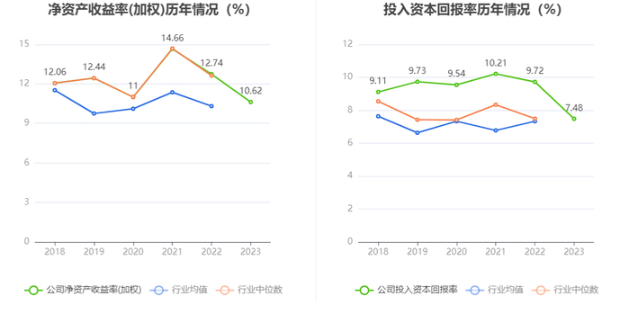 数据显示,2023年公司加权平均净资产收益率为10.62%,较上年同期下降2.12个百分点;公司2023年投入资本回报率为7.48%,较上年同期下降2.24个百分点。