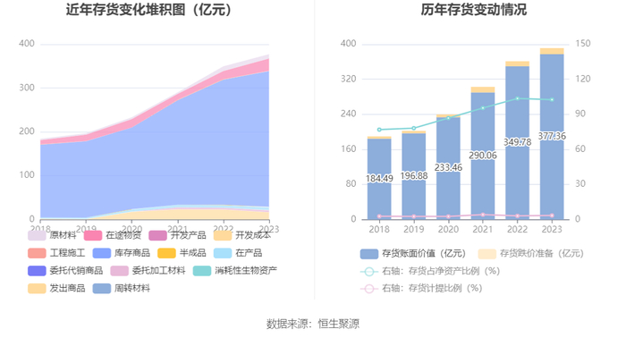从存货变动来看,截至2023年年末,公司存货账面价值为377.36亿元,占净资产的102.64%,较上年末增加27.58亿元。其中,存货跌价准备为13.89亿元,计提比例为3.55%。