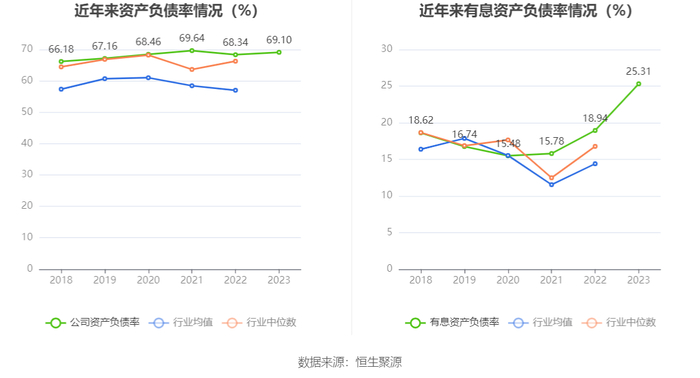 在偿债能力方面,公司2023年年末资产负债率为69.10%,相比上年末上升0.76个百分点;有息资产负债率为25.31%,相比上年末上升6.37个百分点。