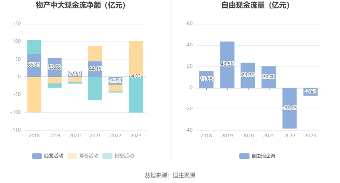 2023年,公司经营活动现金流净额为4.03亿元,同比增加25.44亿元;筹资活动现金流净额98.42亿元,同比增加116.61亿元;投资活动现金流净额-100.21亿元,上年同期为-4.66亿元。