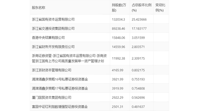 年报显示,2023年年末公司十大流通股东中,新进股东为浙商证券资管-浙江省国有资本运营有限公司-浙商资管浙江国有上市公司高质量发展单一资产管理计划、富国中证红利指数增强型证券投资基金,取代了三季度末的中证500交易型开放式指数证券投资基金、上海上国投资产管理有限公司。在具体持股比例上,香港中央结算有限公司持股有所下降。