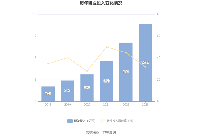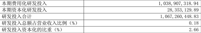 2023年全年,公司研发投入金额为10.67亿元,同比增长31.64%;研发投入占营业收入比例为0.18%,相比上年同期上升0.04个百分点。此外,公司全年研发投入资本化率为2.66%。