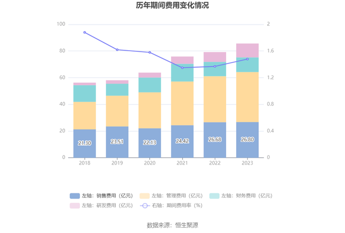 2023年,公司期间费用为85.66亿元,较上年同期增加6.42亿元;期间费用率为1.48%,较上年同期上升0.11个百分点。其中,销售费用同比增长0.45%,管理费用同比增长8.69%,研发费用同比增长41.49%,财务费用同比增长2.36%。