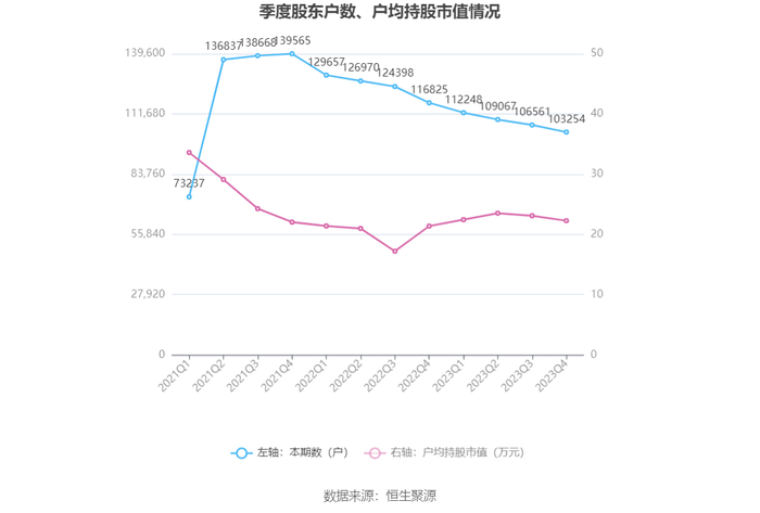 筹码集中度方面,截至2023年年末,公司股东总户数为10.33万户,较三季度末下降了3307户,降幅3.10%;户均持股市值由三季度末的23.10万元下降至22.28万元,降幅为3.55%。