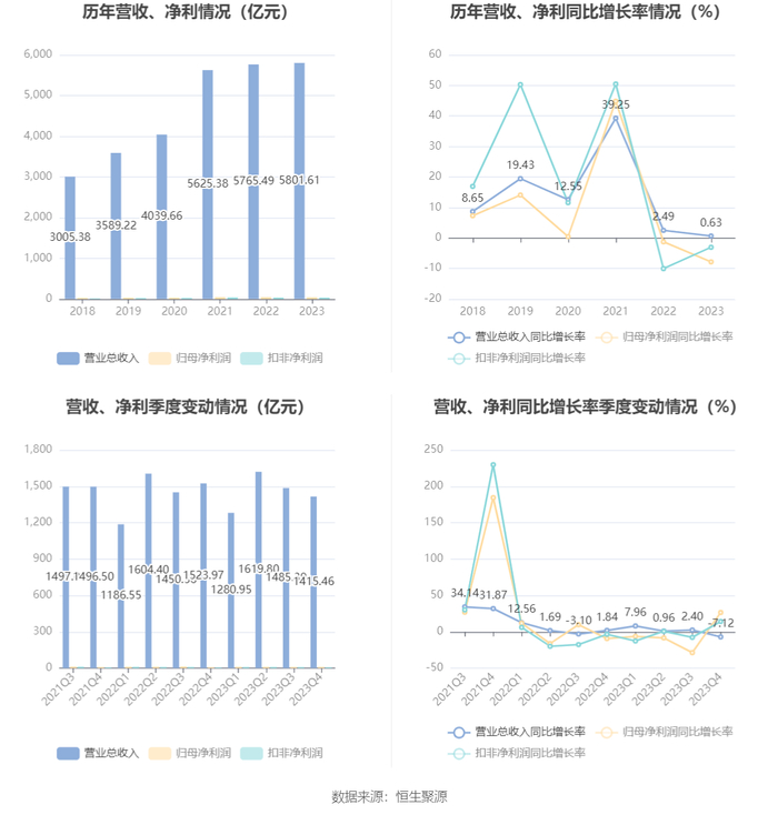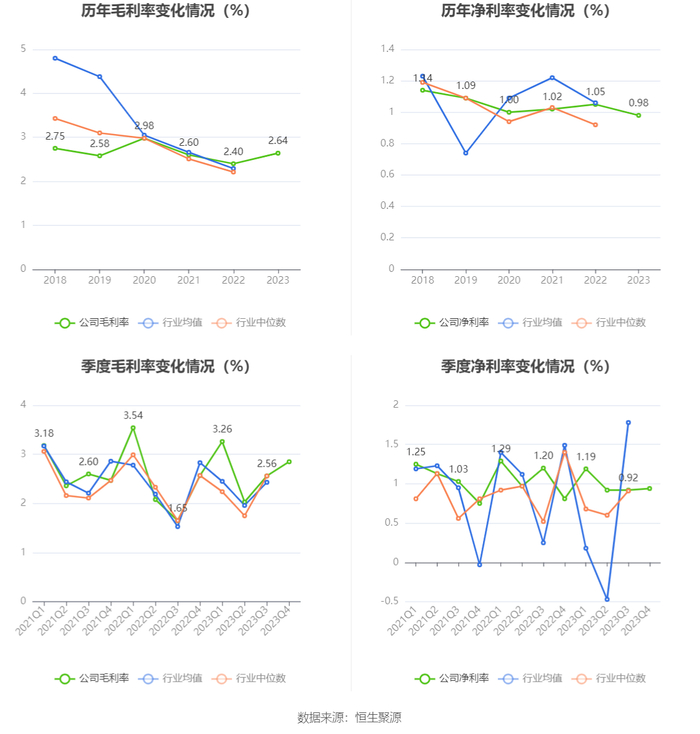 2023年,公司毛利率为2.64%,同比上升0.24个百分点;净利率为0.98%,较上年同期下降0.07个百分点。从单季度指标来看,2023年第四季度公司毛利率为2.85%,同比上升0.28个百分点,环比上升0.29个百分点;净利率为0.94%,较上年同期上升0.13个百分点,较上一季度上升0.02个百分点。