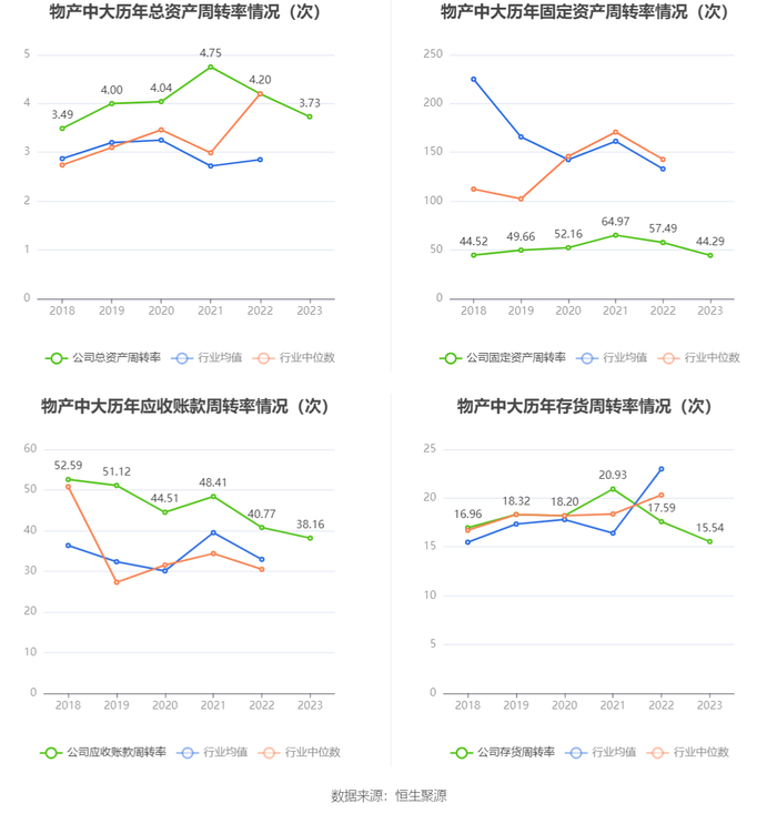 营运能力方面,2023年,公司公司总资产周转率为3.73次,上年同期为4.20次(2022年行业平均值为2.85次,公司位居同行业6/11);固定资产周转率为44.29次,上年同期为57.49次(2022年行业平均值为132.95次,公司位居同行业7/11);公司应收账款周转率、存货周转率分别为38.16次、15.54次。