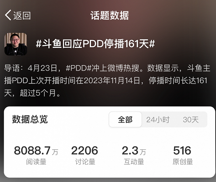 就在小团团确认被捕新闻发出当日,斗鱼另一名大主播PDD的名字也一同冲上热搜。他已经停播了161天,斗鱼客服表示PDD的直播间状态正常,是否开播是个人选择。而“有点人脉”的网友则透露,PDD目前正在日本,何时回国不一定,疑似避风头。