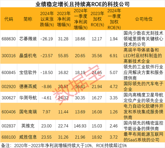 上文提及的阳光电源、斯达半导股价大涨一方面受益于优质的业绩,另一方面与行业景气度向好有一定关系。哪些科技公司未来会有10倍增长潜力?据数据宝统计,上述306股中,满足条件2020年至2023年净利润增幅持续超过10%,ROE持续超过5%;2024年一季度净利润增幅超过10%,ROE大于0的公司仅有8家。