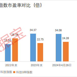 从估值来看,早在2020年末,道琼斯美国科技指数市盈率38.84倍,A股科技100指数大幅超越前者,接近50倍;2023年末,前者市盈率仅小幅下降至34倍左右,A股科技100指数市盈率仅剩22.75倍;截至2024年4月26日,道琼斯美国科技指数市盈率依然有34倍以上,A股科技100指数市盈率维持24倍左右。相比之下,A股科技板块当前估值更接近最近5年的市盈率最低值。