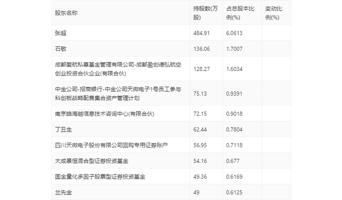 年报显示,2023年年末公司十大流通股东中,新进股东为国金量化多因子股票型证券投资基金、兰先金,取代了三季度末的四川威比特投资有限公司、国金创新投资有限公司。在具体持股比例上,成都爱航私募基金管理有限公司-成都盈创德弘航空创业投资合伙企业(有限合伙)、中金公司-招商银行-中金公司天微电子1号员工参与科创板战略配售集合资产管理计划、南京皓海越信息技术咨询中心(有限合伙)持股有所下降。