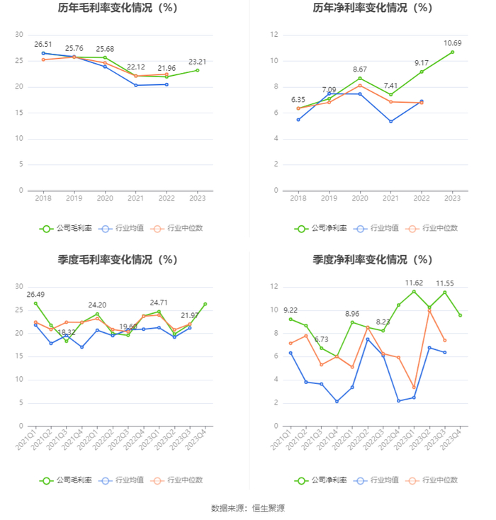 2023年,公司毛利率为23.21%,同比上升1.25个百分点;净利率为10.69%,较上年同期上升1.52个百分点。从单季度指标来看,2023年第四季度公司毛利率为26.34%,同比上升2.57个百分点,环比上升4.37个百分点;净利率为9.56%,较上年同期下降0.89个百分点,较上一季度下降1.99个百分点。